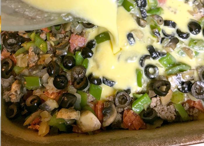 - Pour Pizza Sauce over Meat, Veggies, and Egg layers.