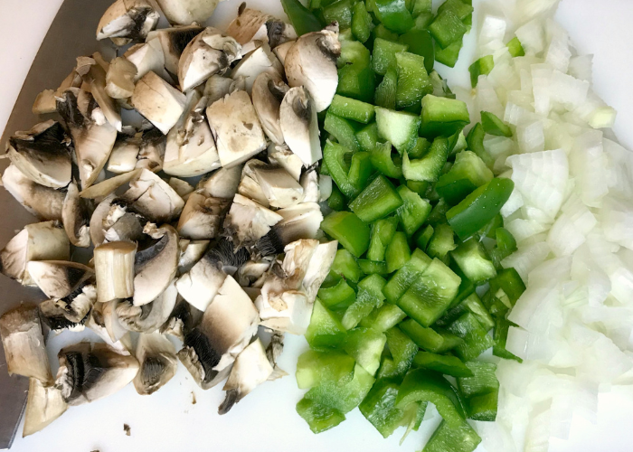 - Preheat Oven to 350 F. Chop the Bell Pepper, Onion, and Mushrooms.