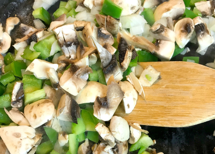 - In a skillet over a medium-high heat, add Olive Oil. When Oil is heated, add Bell Pepper, Onion, and Mushrooms. Sauté until softened, about 5 minutes. Set aside in a bowl.
