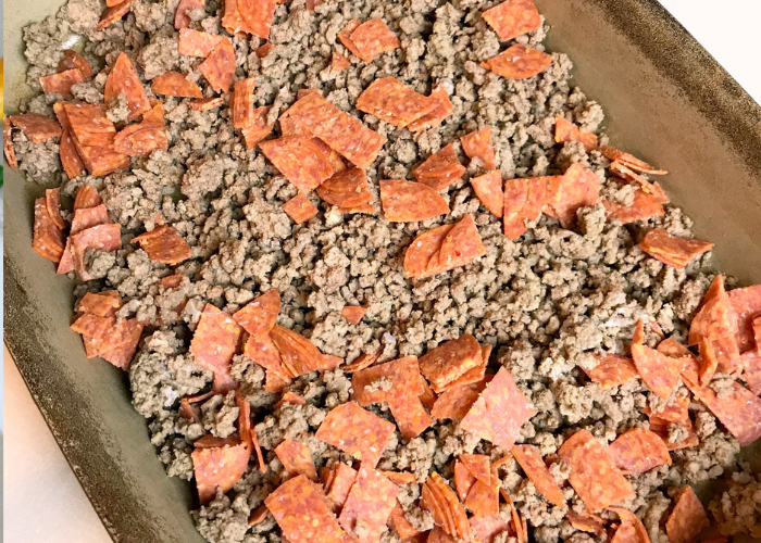 - Spray the 9×13 Casserole Dish with Non-Stick Cooking Spray. Add Ground Beef and Pepperoni (Reserving a few for the top), tossing together slightly.